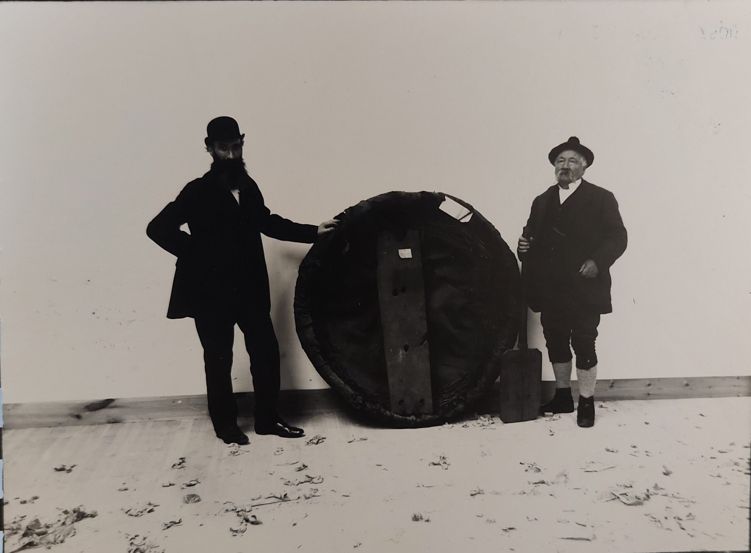 Elgin Museum’s Spey Coracle. Date of photo unknown but possibly 1886. On the right is Captain James Brander Dunbar Brander who died in 1901. Photo courtesy of the late Alexander Dunbar, Pitgaveny, Elgin. © Elgin Museum.